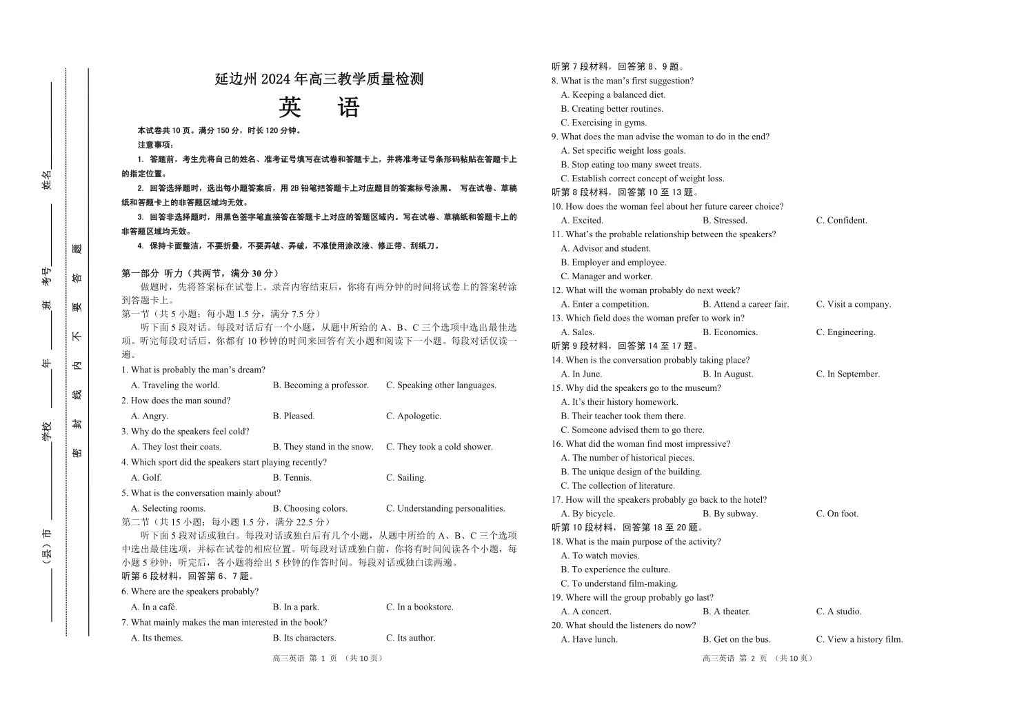 吉林省延边州2024届高三教学质量检测(一模)英语