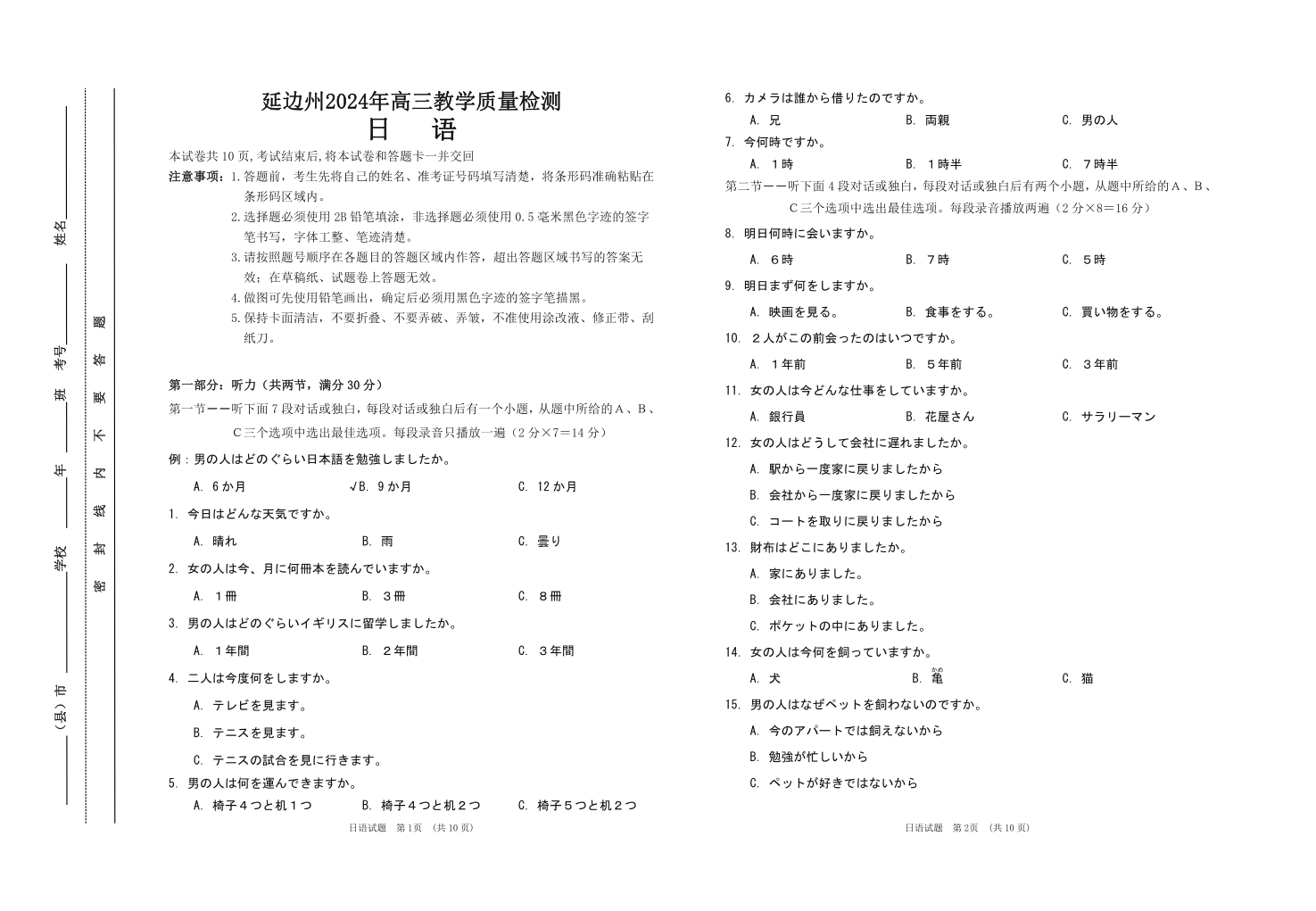吉林省延边州2024届高三教学质量检测(一模)日语
