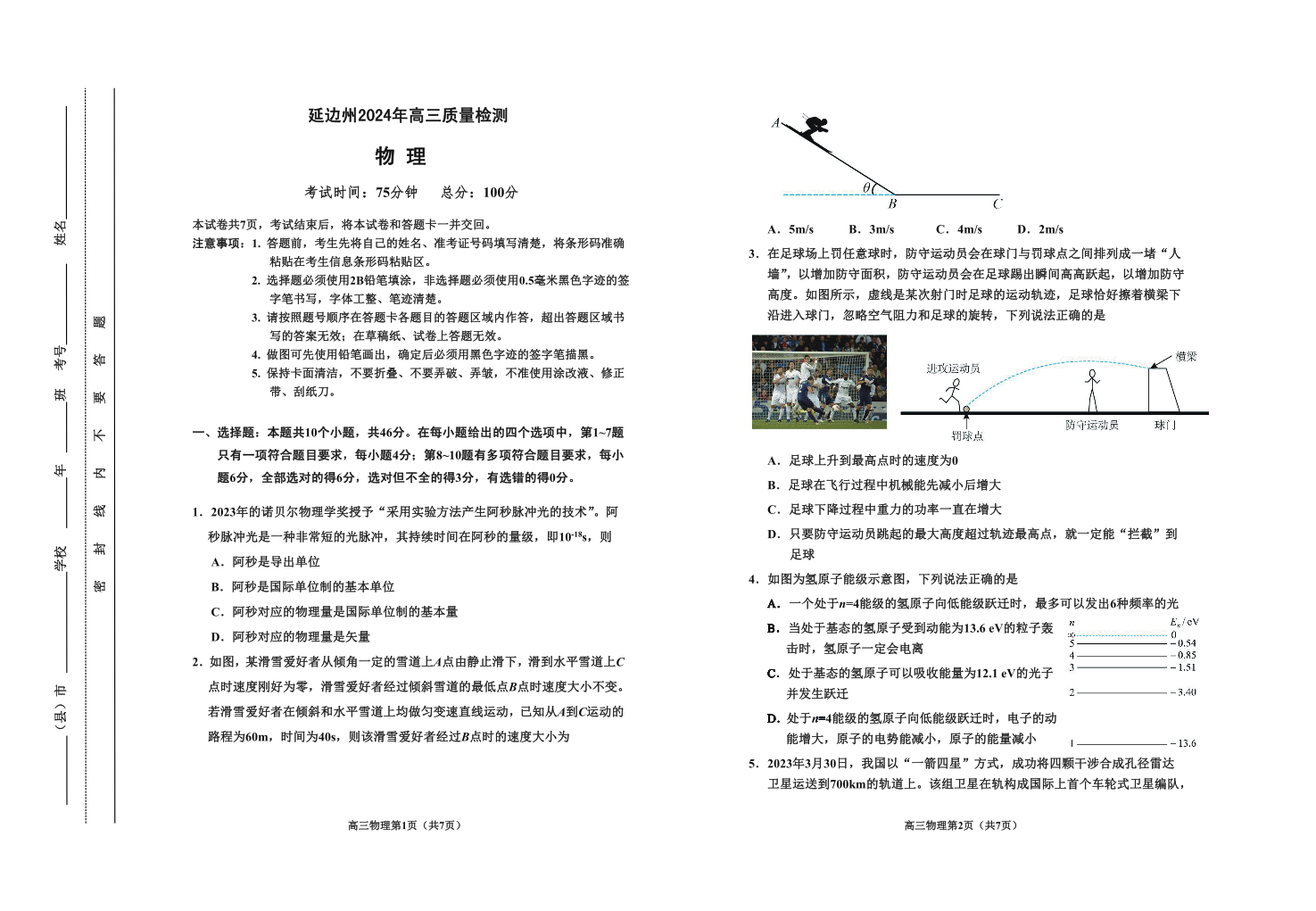 吉林省延边州2024届高三教学质量检测(一模)物理