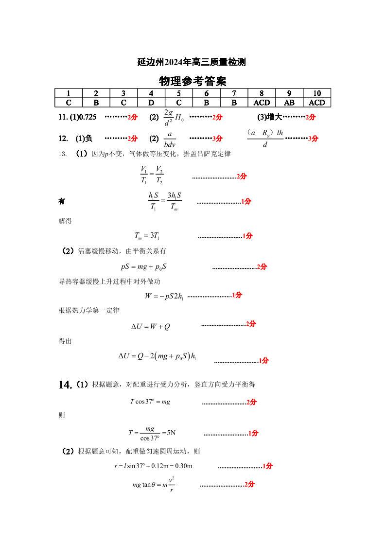 吉林省延边州2024届高三教学质量检测(一模)物理答案