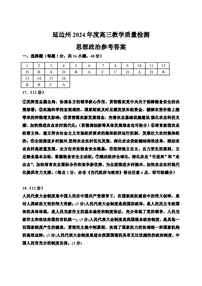 吉林省延边州2024届高三教学质量检测(一模)政治答案