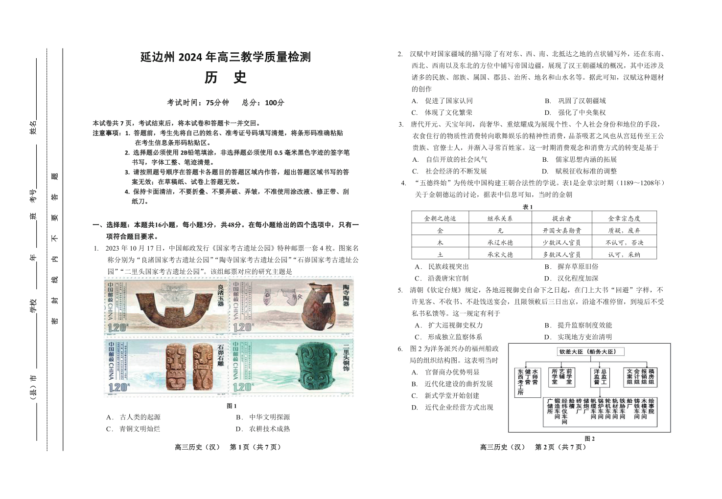 吉林省延边州2024届高三教学质量检测(一模)历史