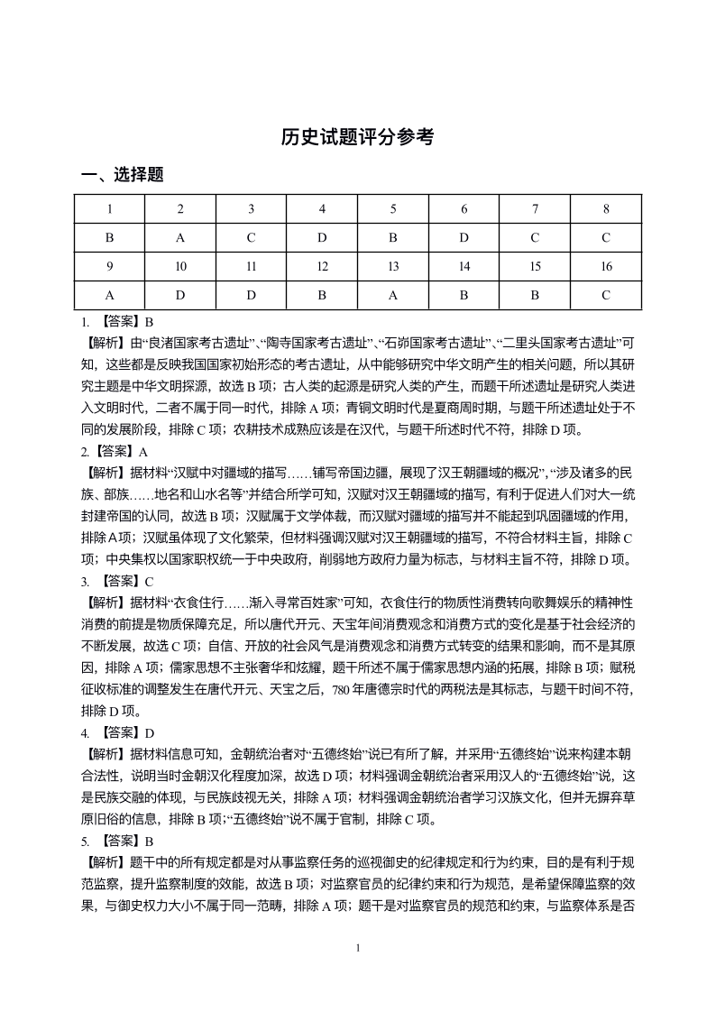 吉林省延边州2024届高三教学质量检测(一模)历史答案