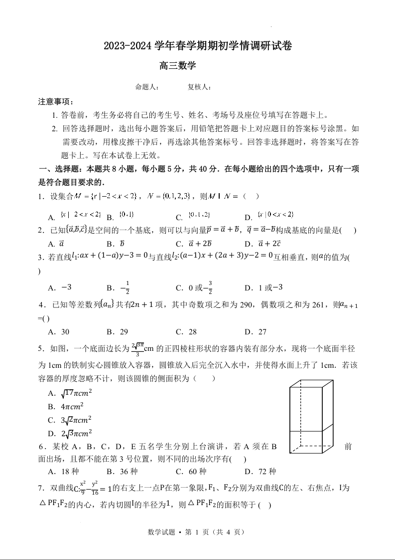 江苏省无锡市四校2024届高三下学期期初学期调研数学