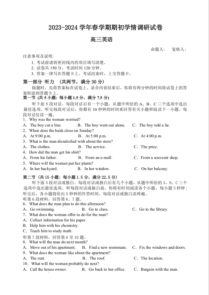 江苏省无锡市四校2024届高三下学期期初学期调研英语