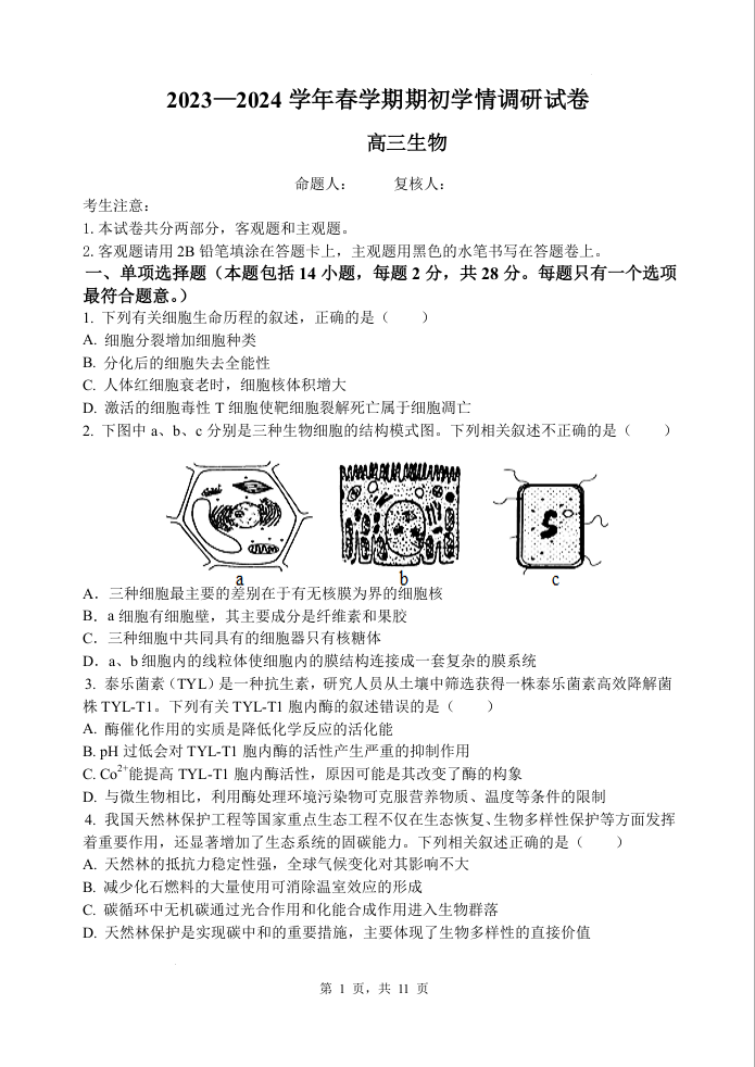 江苏省无锡市四校2024届高三下学期期初学期调研生物