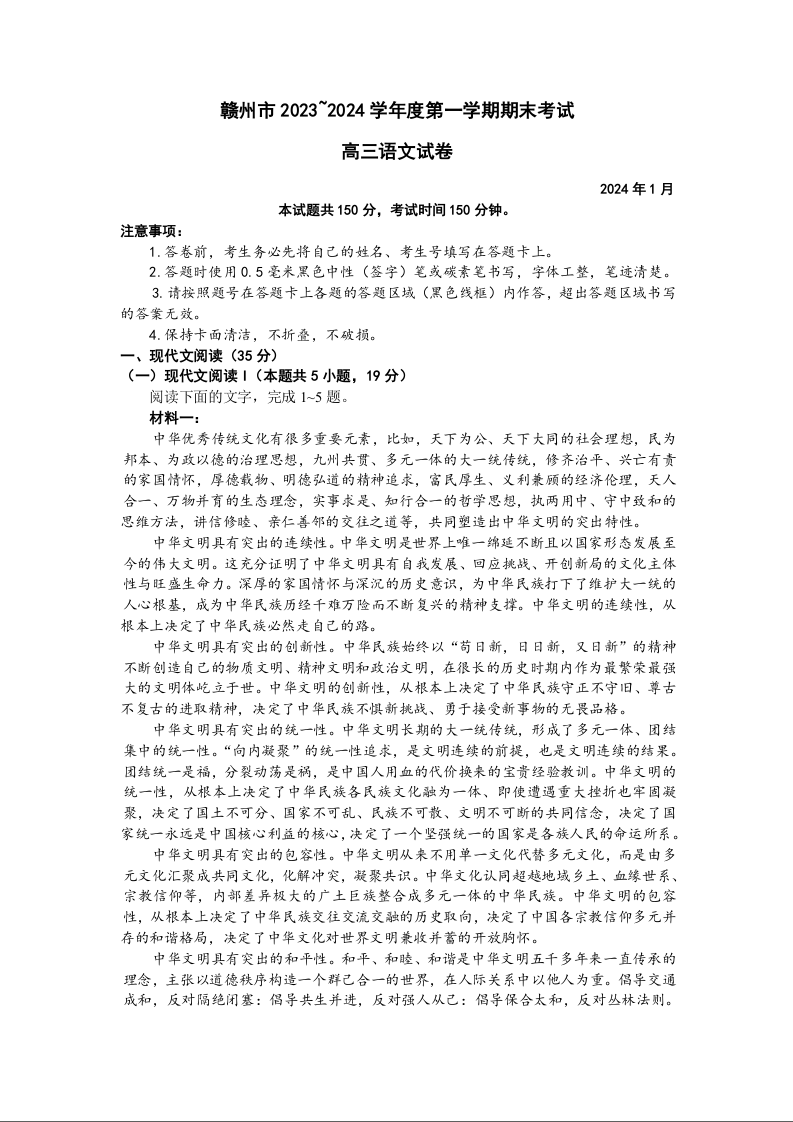 江西省赣州市2024届高三上学期期末考试语文