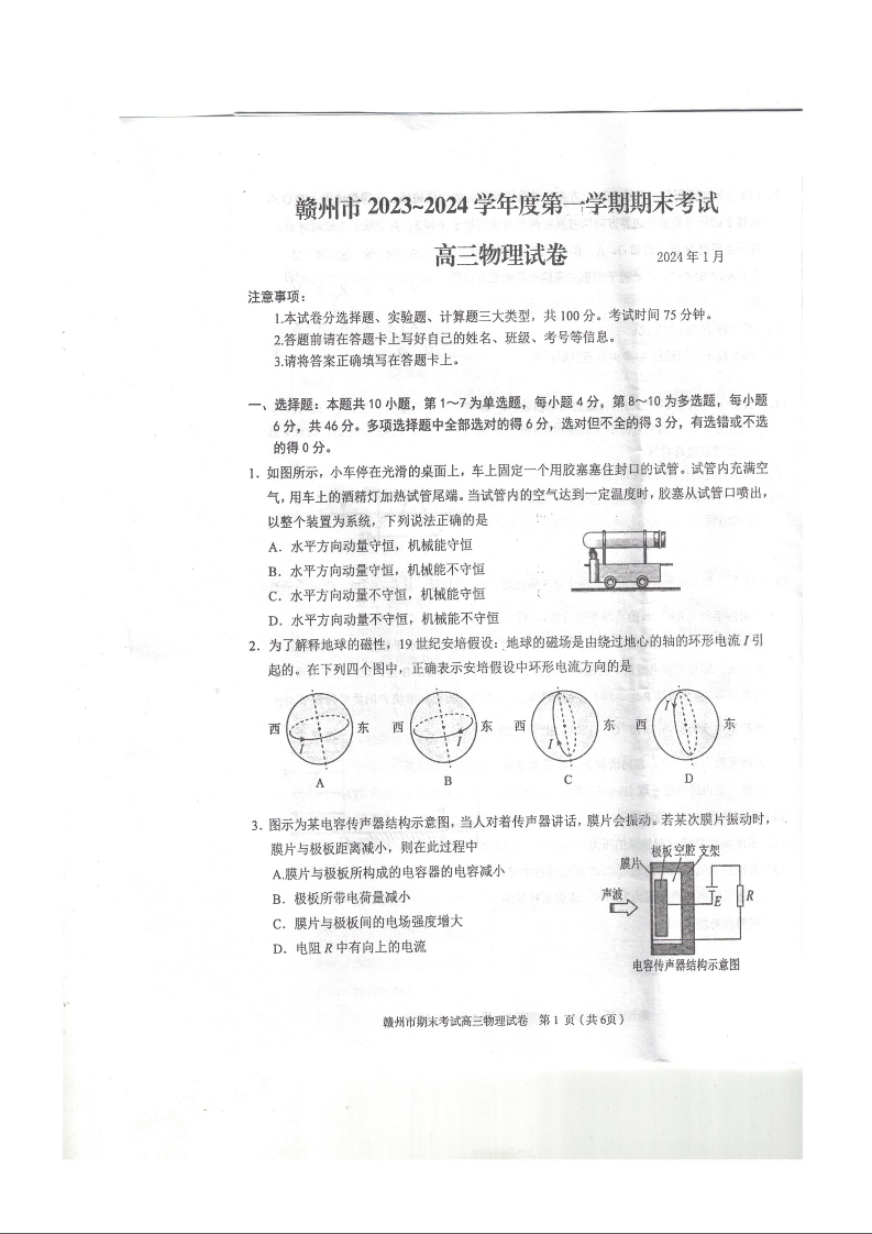 江西省赣州市2024届高三上学期期末考试物理