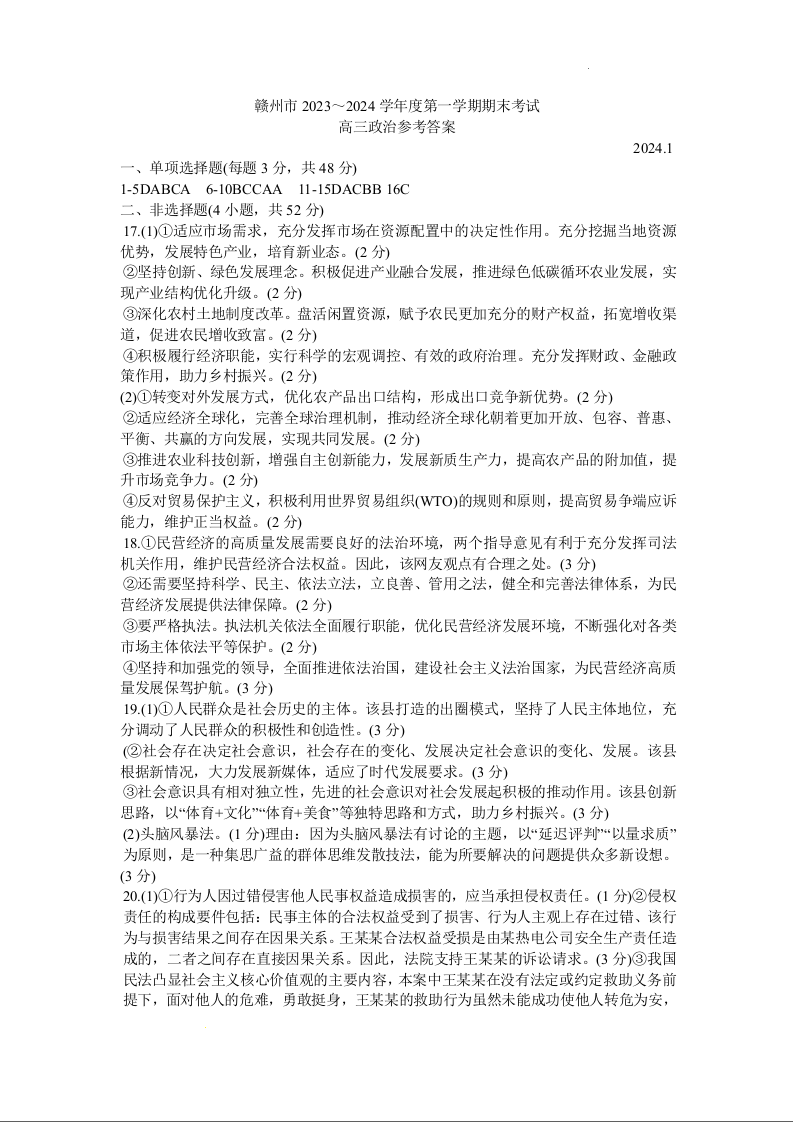 江西省赣州市2024届高三上学期期末考试政治答案