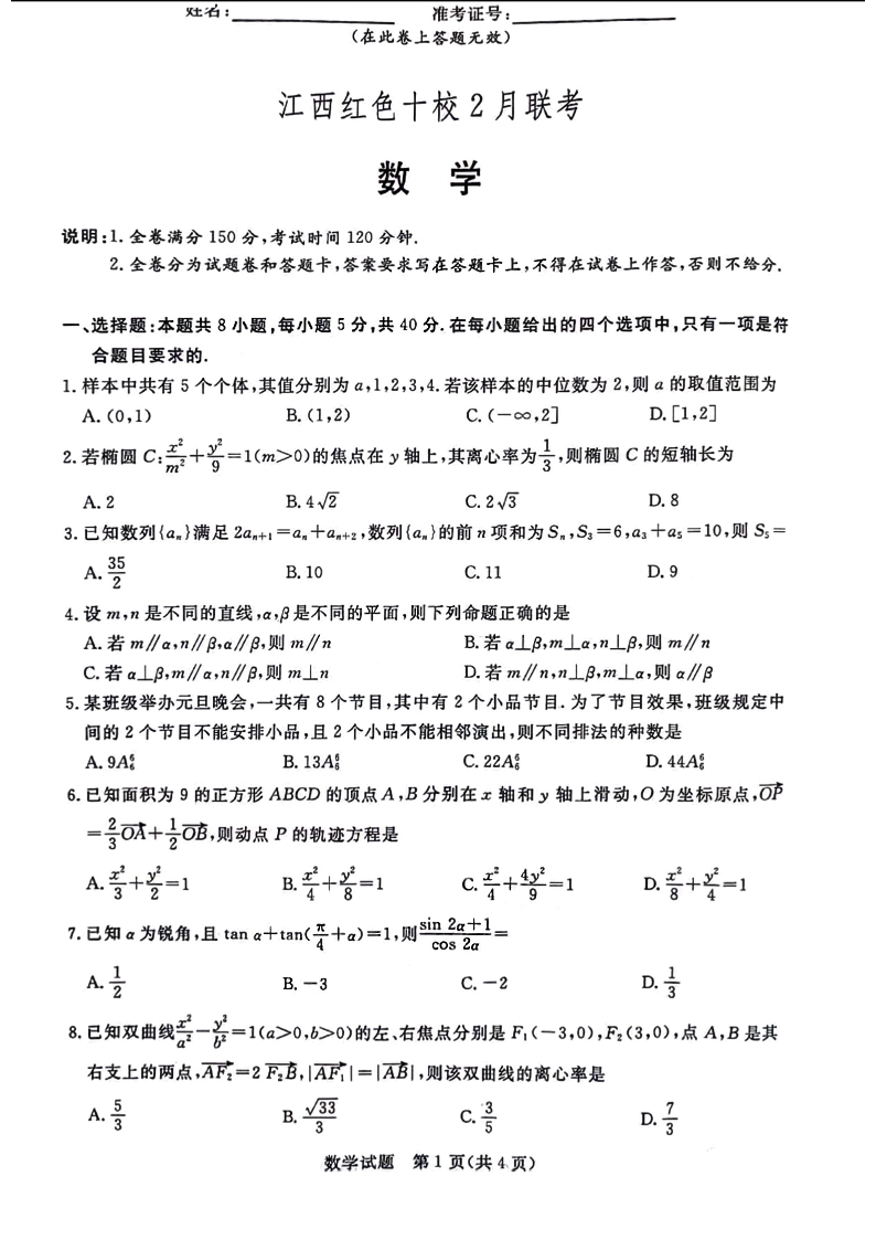 江西省红色十校2024届高三下学期2月联考数学+答案