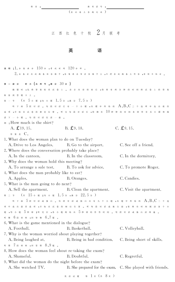 江西省红色十校2024届高三下学期2月联考英语试卷