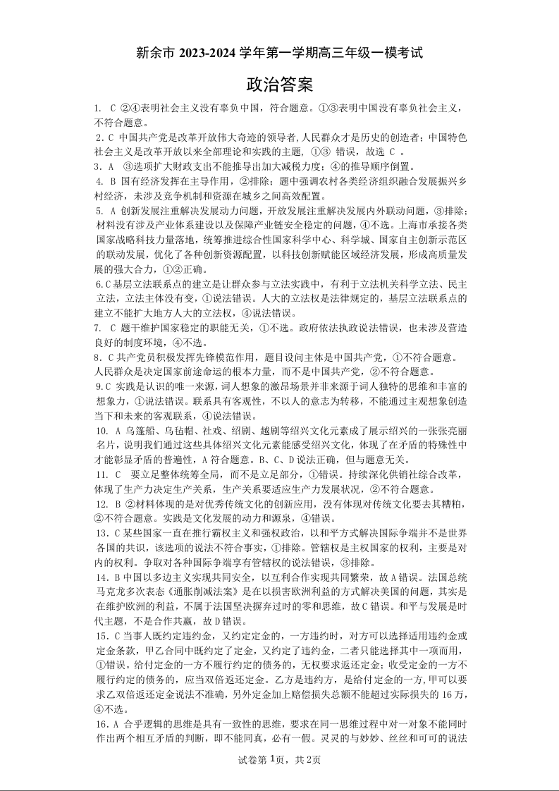 江西省新余市2024届高三上学期期末质量检测政治答案