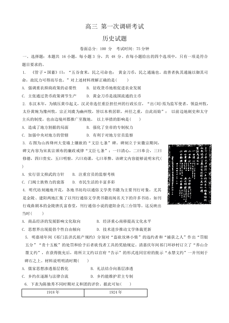 江西省新余市2024届高三上学期期末质量检测历史+答案