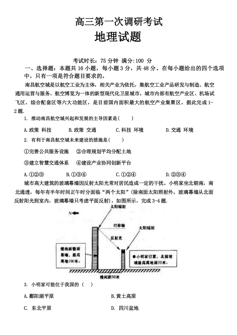 江西省新余市2024届高三上学期期末质量检测地理