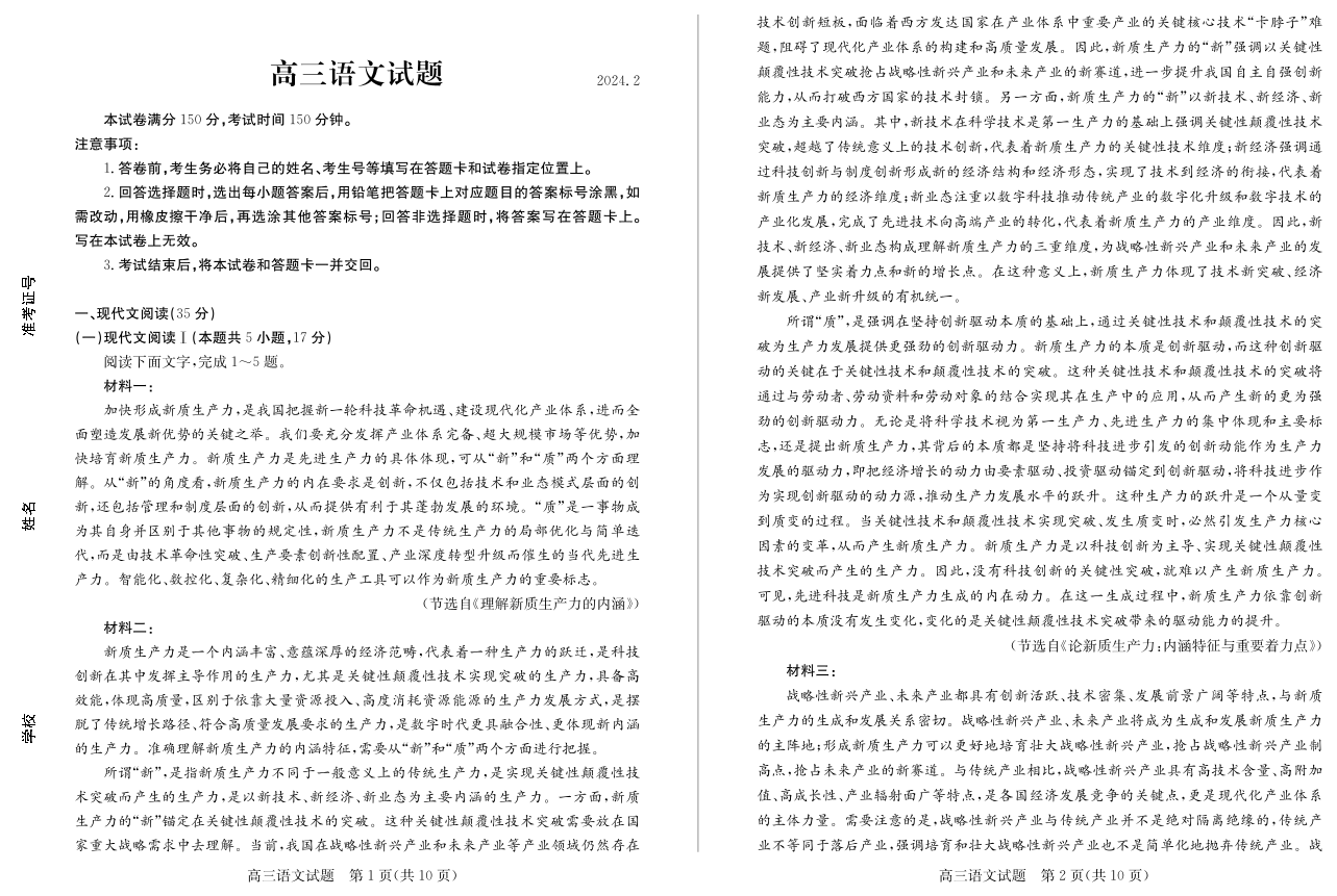 山东省德州市“优高联盟”2024届高三2月诊断性检测语文
