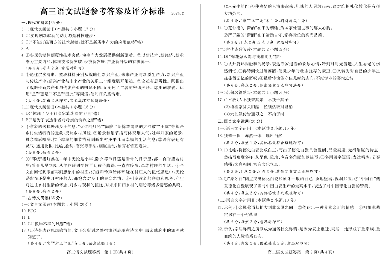 山东省德州市“优高联盟”2024届高三2月诊断性检测语文答案
