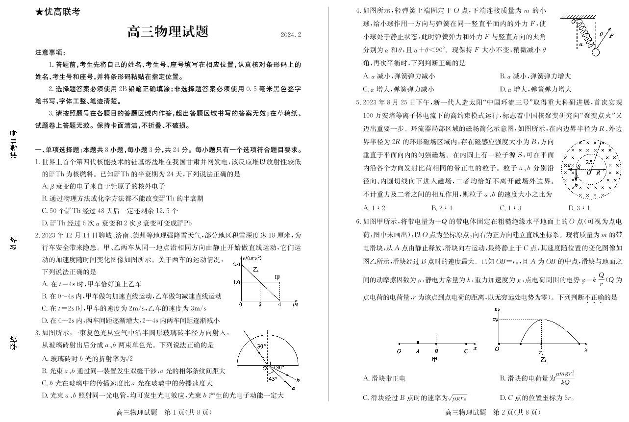 山东省德州市“优高联盟”2024届高三2月诊断性检测物理