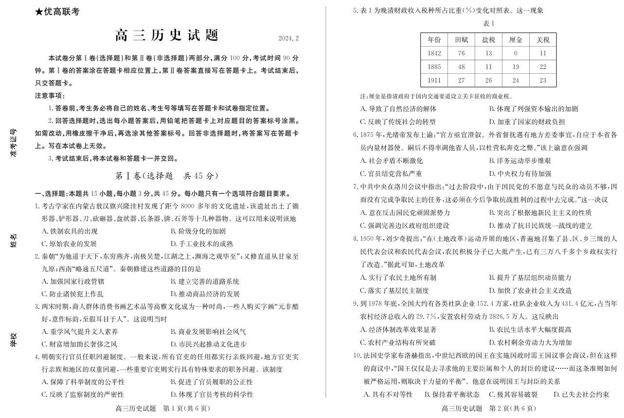 山东省德州市“优高联盟”2024届高三2月诊断性检测历史