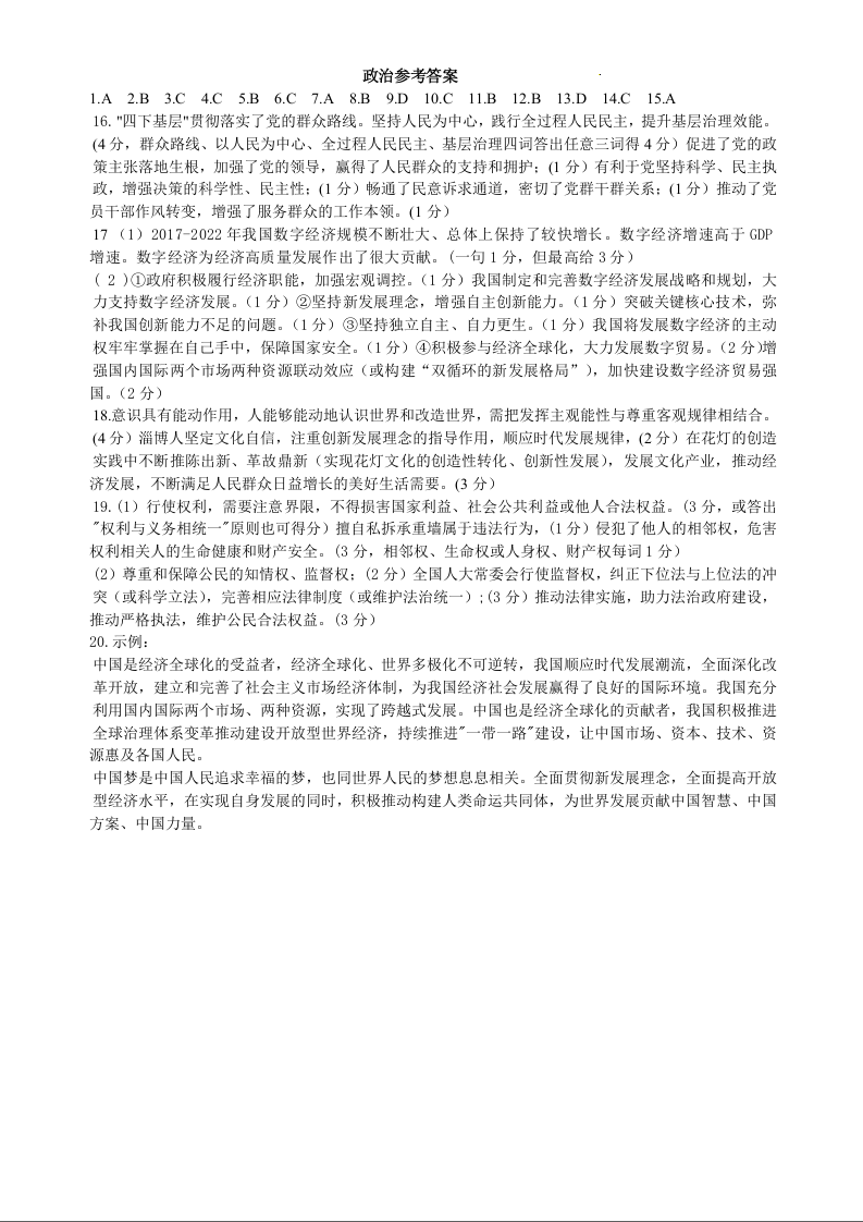 山东省济宁市第一中学2024届高三上学期2月定时检测(期末)政治答案