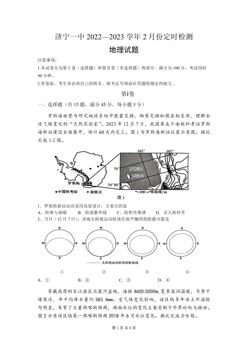 山东省济宁市第一中学2024届高三上学期2月定时检测(期末)地理