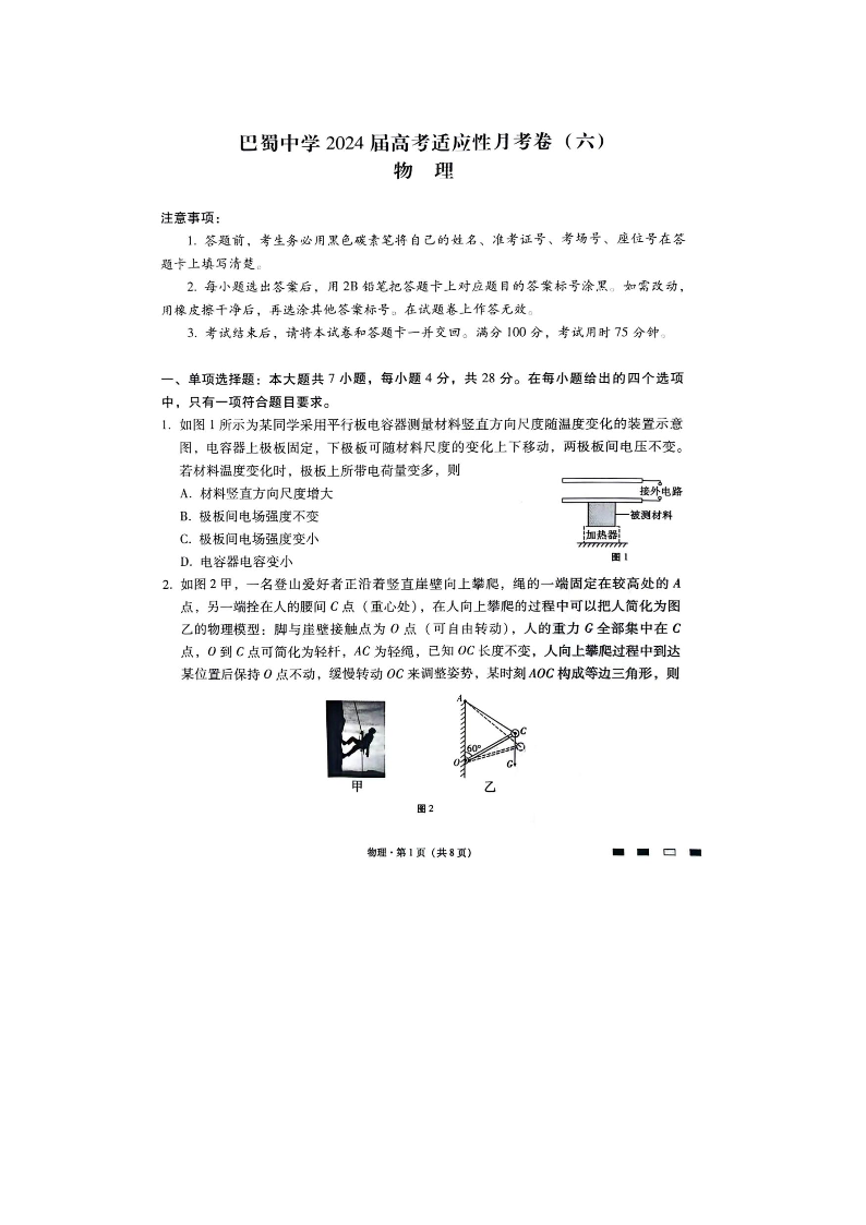 重庆市巴蜀中学2024 届高考适应性月考卷 (六)物理