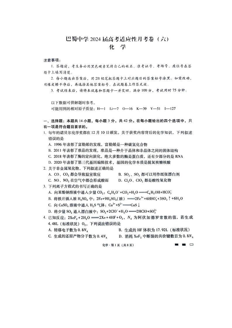 重庆市巴蜀中学2024 届高考适应性月考卷 (六)化学