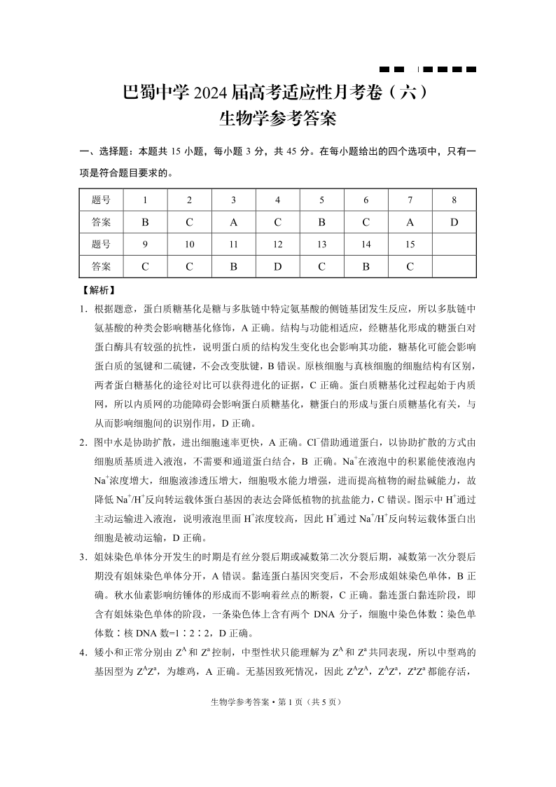 重庆市巴蜀中学2024 届高考适应性月考卷 (六)生物答案