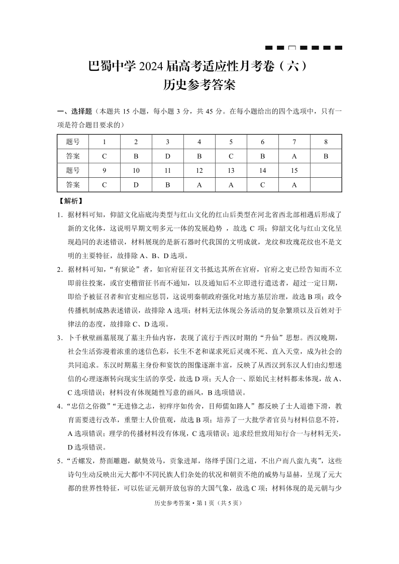 重庆市巴蜀中学2024 届高考适应性月考卷 (六)历史答案