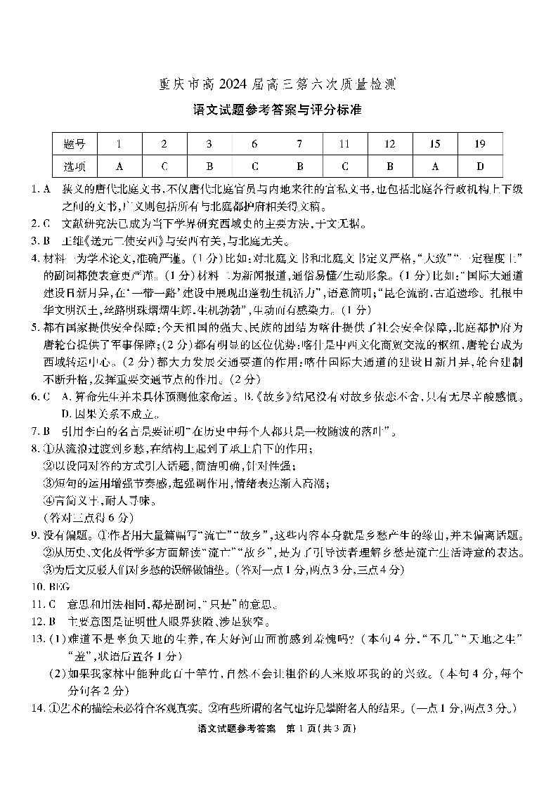 重庆市南开中学高2024届高三第六次质量检测语文答案
