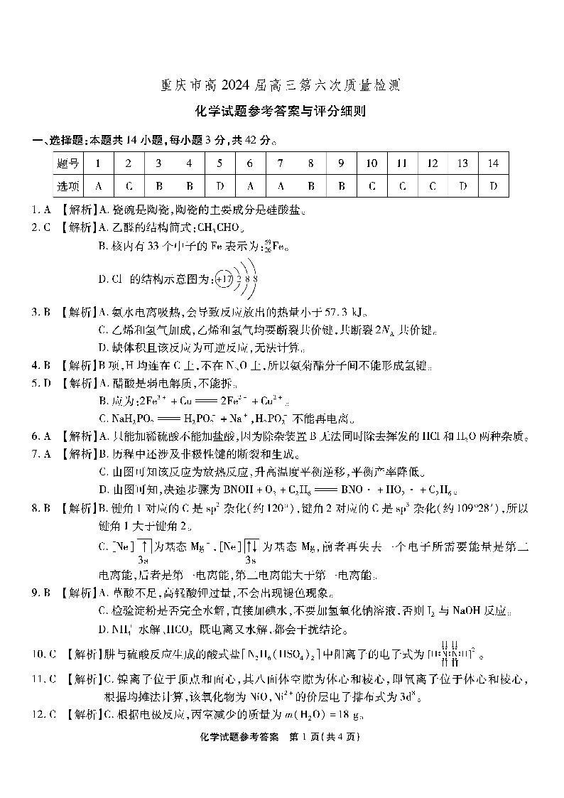 重庆市南开中学高2024届高三第六次质量检测化学答案
