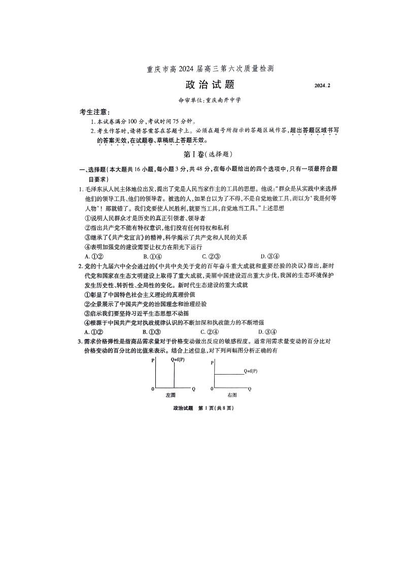 重庆市南开中学高2024届高三第六次质量检测政治