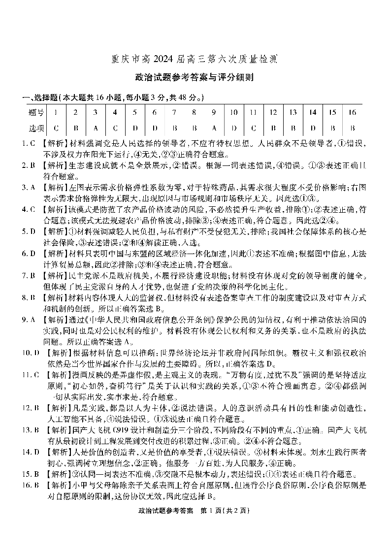 重庆市南开中学高2024届高三第六次质量检测政治答案