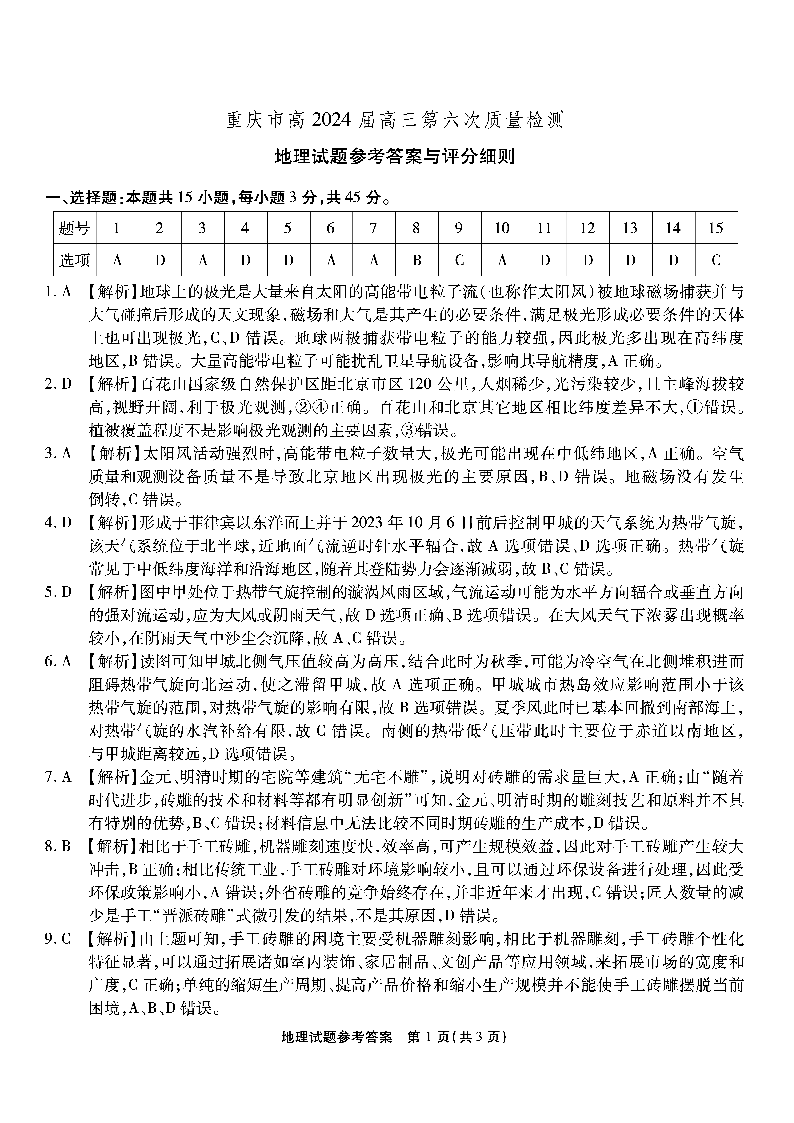 重庆市南开中学高2024届高三第六次质量检测地理答案