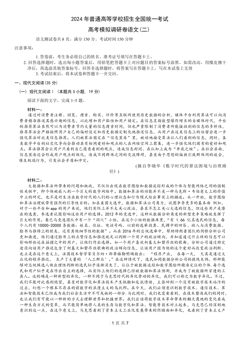 重庆康德2024年普通高等学校招生全国统一考试高考模拟调研卷(二)语文