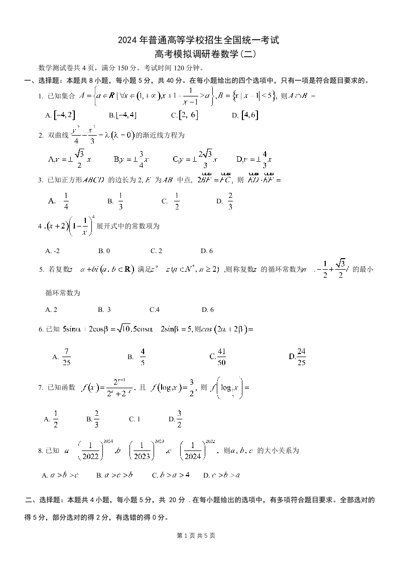重庆康德2024年普通高等学校招生全国统一考试高考模拟调研卷(二)数学