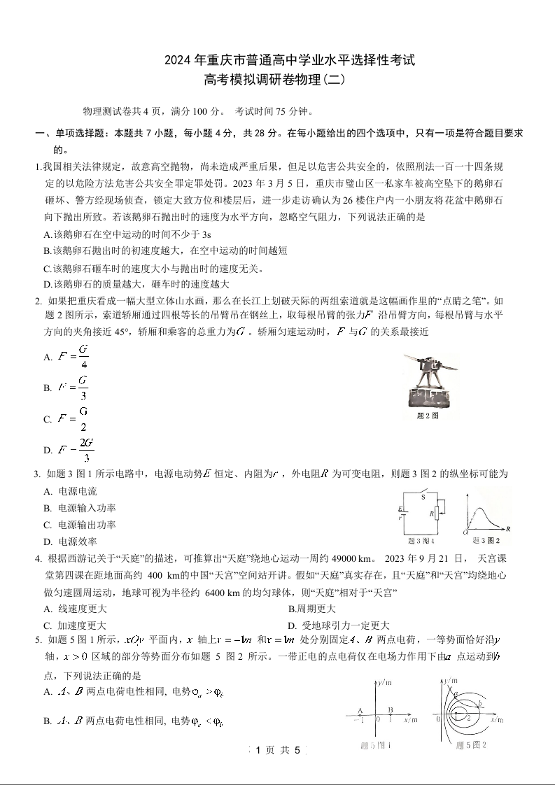 重庆康德2024年普通高等学校招生全国统一考试高考模拟调研卷(二)物理