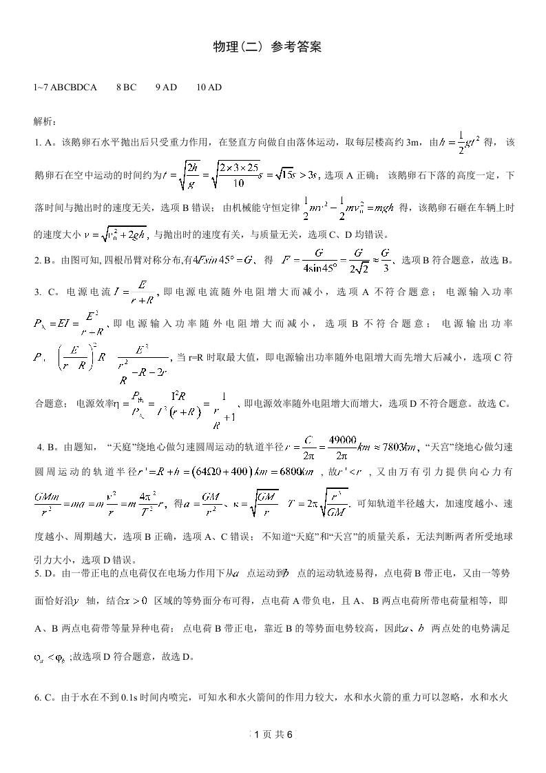 重庆康德2024年普通高等学校招生全国统一考试高考模拟调研卷(二)物理答案