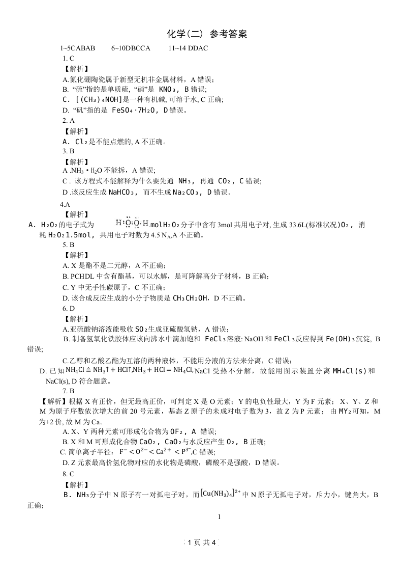 重庆康德2024年普通高等学校招生全国统一考试高考模拟调研卷(二)化学答案