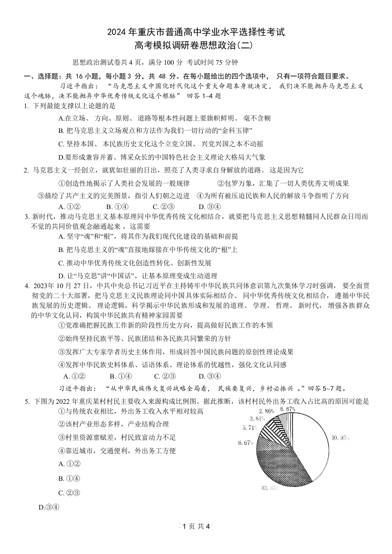 重庆康德2024年普通高等学校招生全国统一考试高考模拟调研卷(二)政治