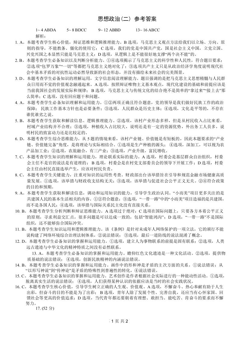 重庆康德2024年普通高等学校招生全国统一考试高考模拟调研卷(二)政治答案