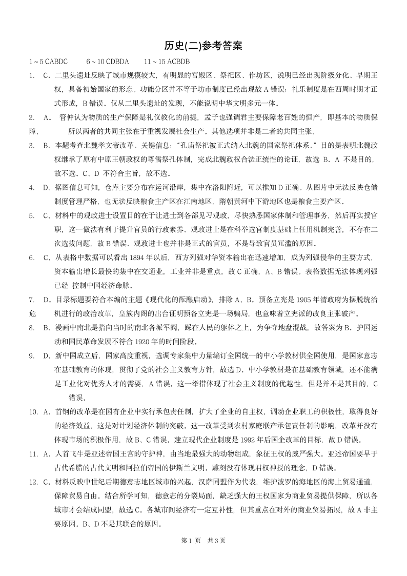 重庆康德2024年普通高等学校招生全国统一考试高考模拟调研卷(二)历史答案