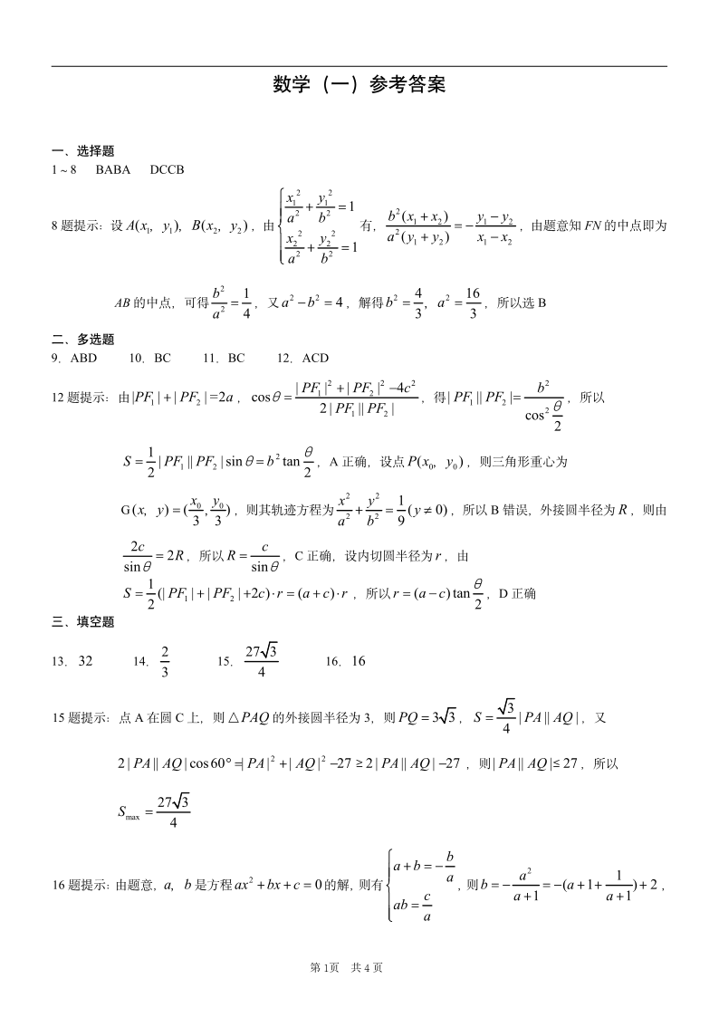 重庆康德2024年普通高等学校招生全国统一考试高考模拟调研卷(一)数学答案