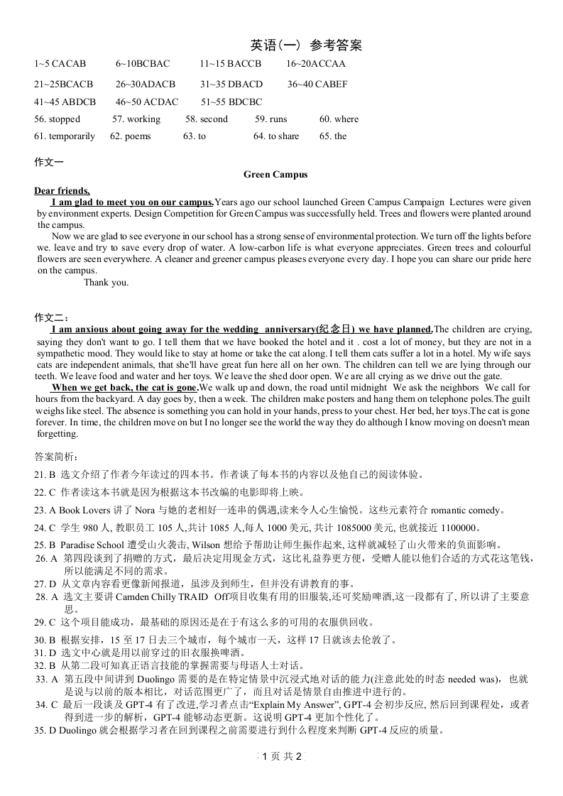 重庆康德2024年普通高等学校招生全国统一考试高考模拟调研卷(一)英语答案