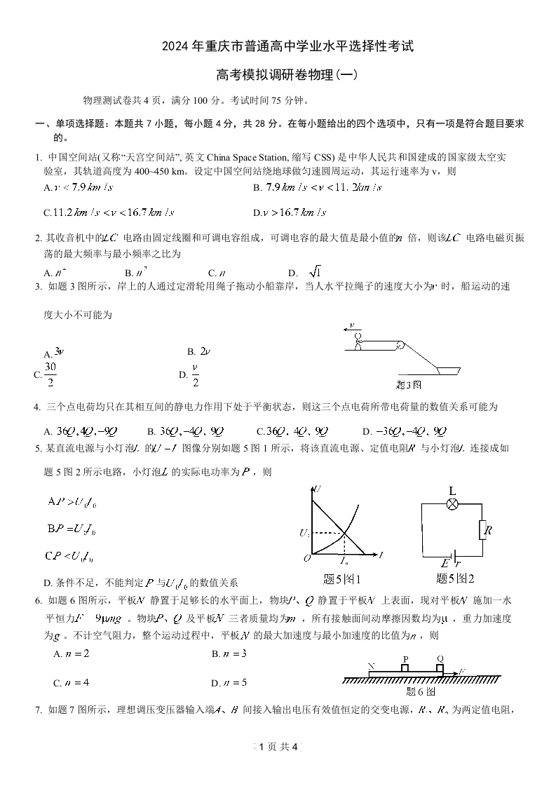 重庆康德2024年普通高等学校招生全国统一考试高考模拟调研卷(一)物理