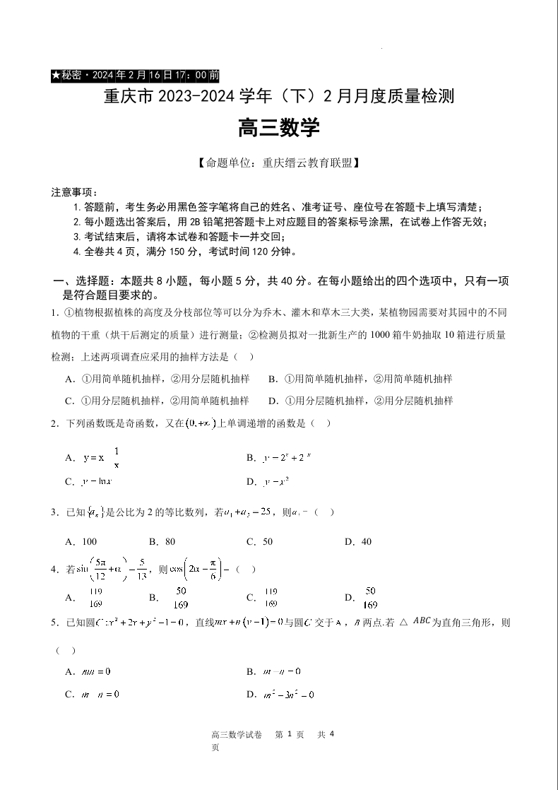 重庆市缙云教育联盟2024届高三下学期2月月度质量检测数学