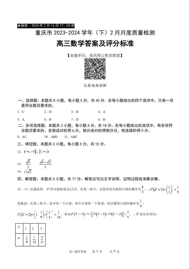 重庆市缙云教育联盟2024届高三下学期2月月度质量检测数学答案