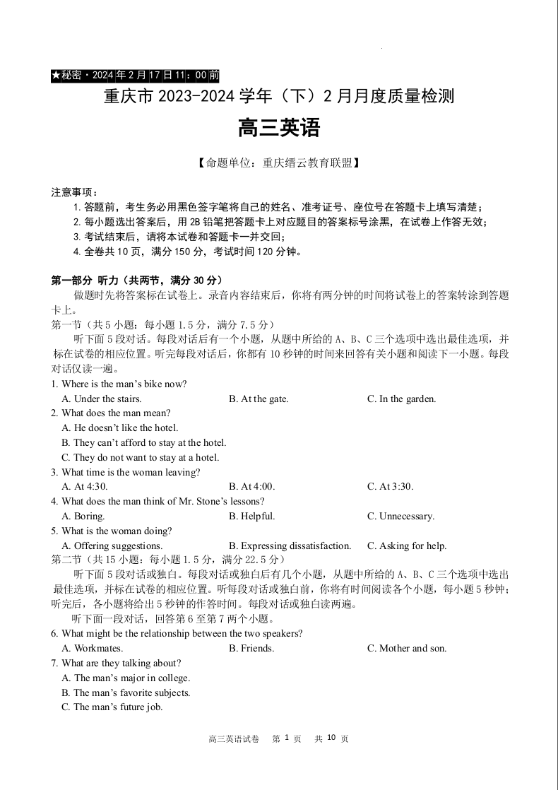 重庆市缙云教育联盟2024届高三下学期2月月度质量检测英语
