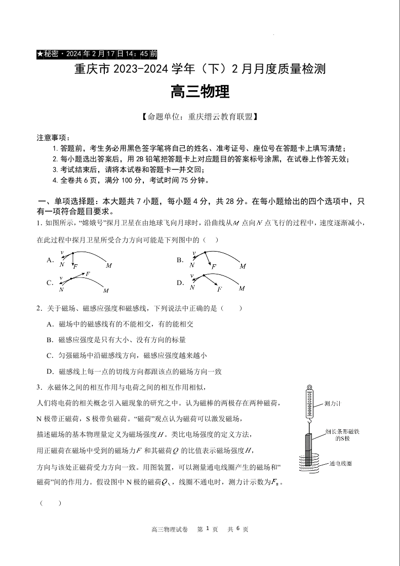 重庆市缙云教育联盟2024届高三下学期2月月度质量检测物理