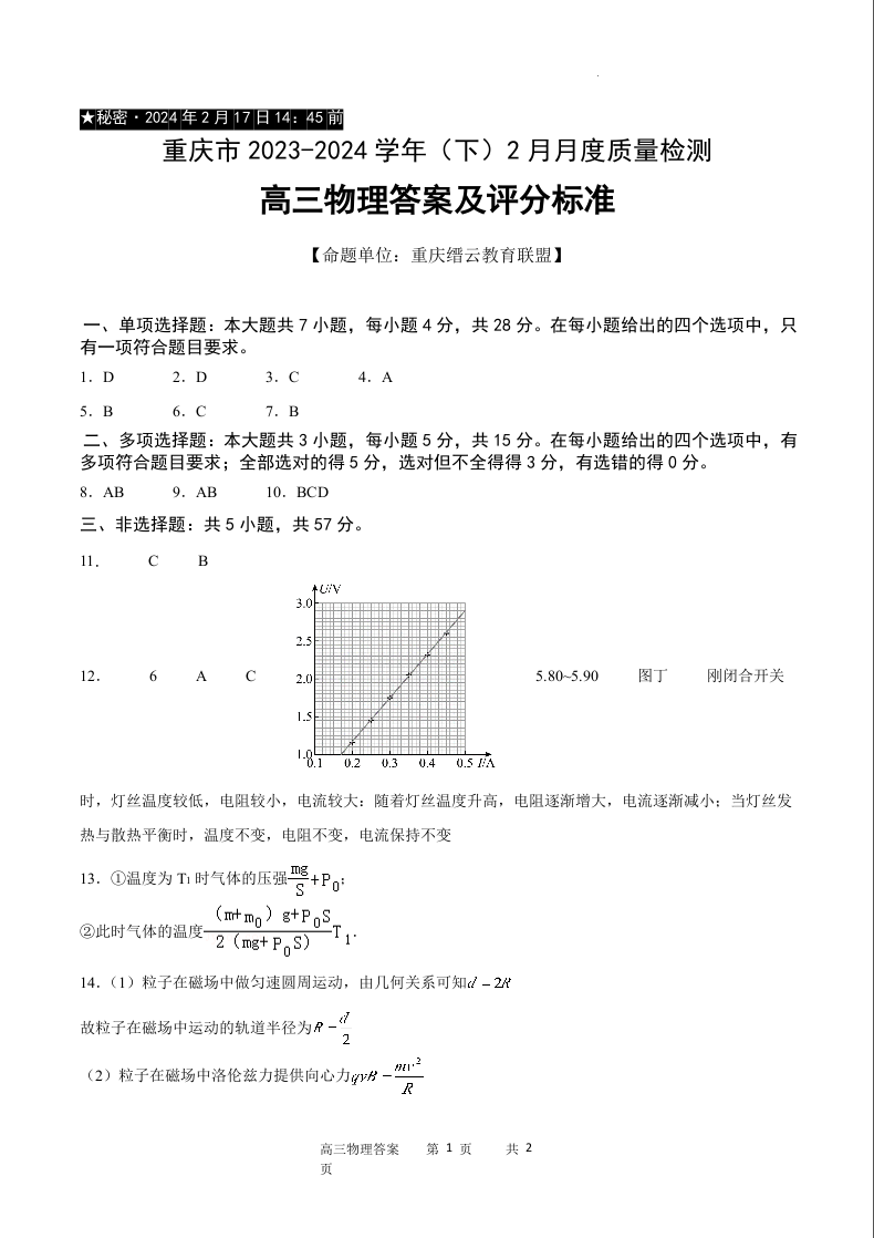 重庆市缙云教育联盟2024届高三下学期2月月度质量检测物理答案
