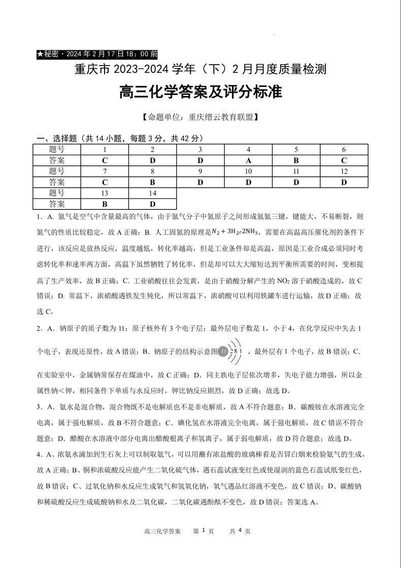 重庆市缙云教育联盟2024届高三下学期2月月度质量检测化学答案